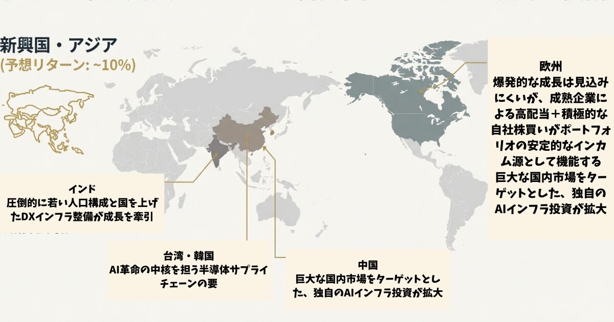 | 新興国株 | 10.9% | 最も高いリターン予測。名目成長・AI投資・構造改革が追い風 | |