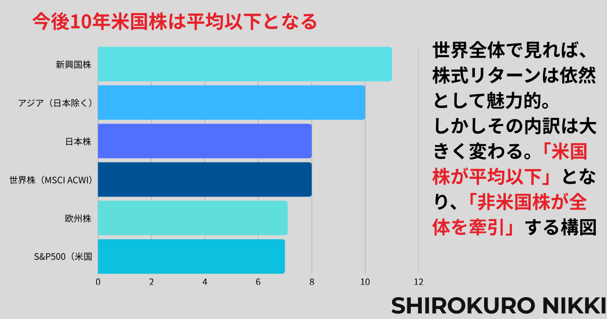 | MSCI World ex US | 約8.0% | 非米国先進国が米国を明確に上回る予測 |