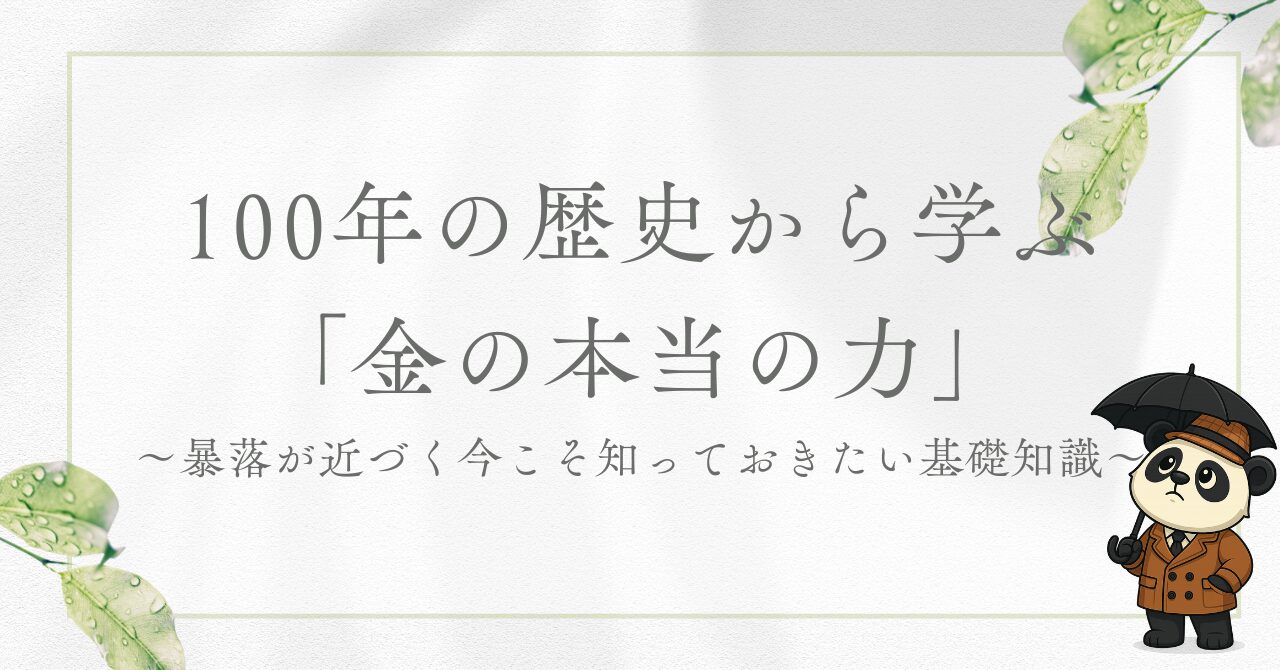 1929年〜現在までの暴落期のデータ、金と株の100年比較 、 現代マクロ環境 、金の最適な保有比率など、徹底的に深掘りします。