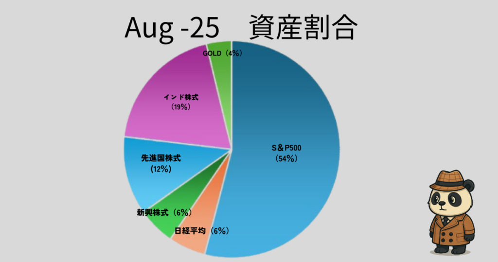 2025年8月末時点の資産ポートフォリオ。各資産クラスの評価額割合を示す。