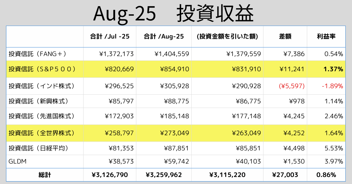 各投資資産の2025年7月末と8月末の評価額・損益。日本株(日経平均連動)の伸びが際立つ一方、インド株は評価額が前月比でマイナスとなった。