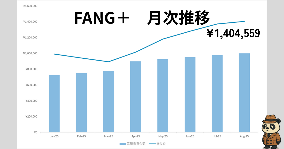 FANG+(米ハイテク大型株中心の株価指数)への投資は、積立投資とスポット購入を併用して継続しています。2025年8月末時点でFANG+投資の評価額合計は1,404,559円となり、月間リターンは +0.54% と横ばいで推移しました。積立投資で継続的に買い増しているため、足元で横ばいでも特に気にせず、むしろ価格が安くなれば割安に買えると考えてホールドを続けています。