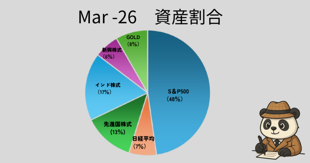 全体として株式比率が高く、依然としてリスク資産寄りのポートフォリオです。