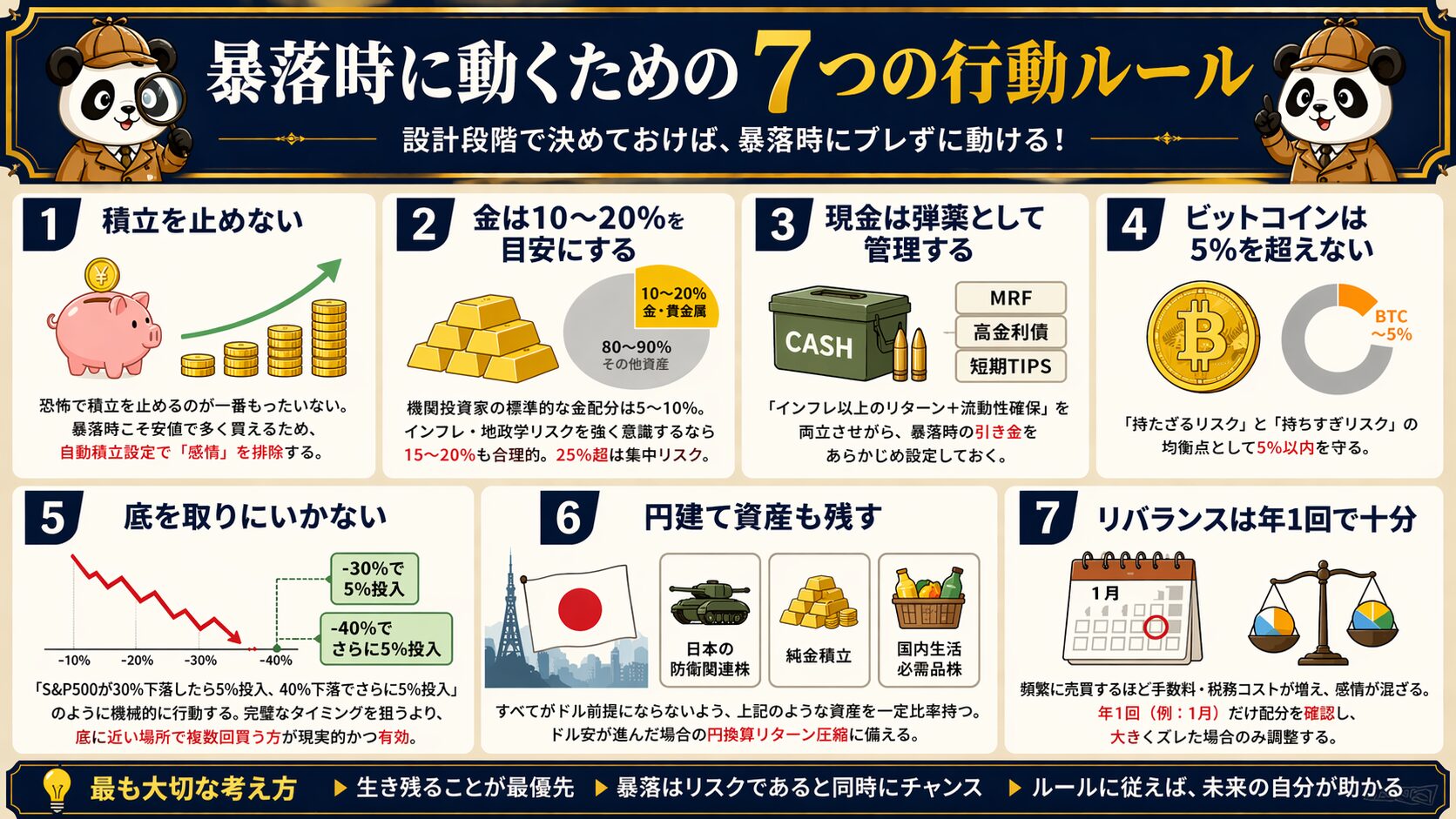 - 暴落後に動ける自分でいる——設計だけでなく、行動ルールまで決めておく