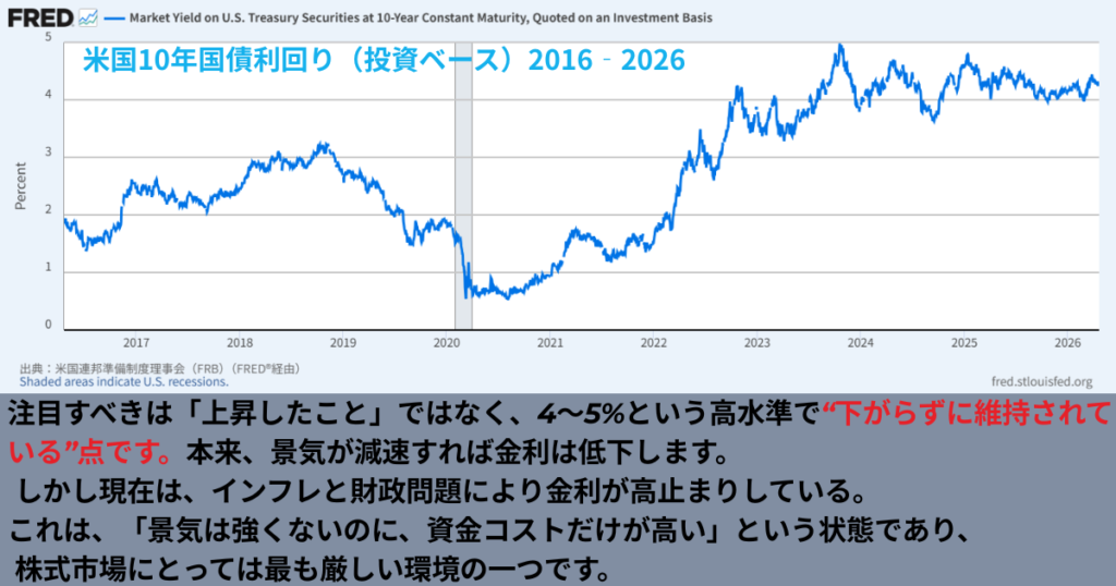 その根拠は3つです。第一に、米国の財政構造から見て歳出削減も大幅増税もどちらも政治的に困難であり、緩やかな財政拡張が続く可能性が高い。第二に、地政学的緊張が資源コストを高止まりさせやすい環境にある。第三に、FRBが「インフレ」と「景気」を同時に満足させられる余地がない。