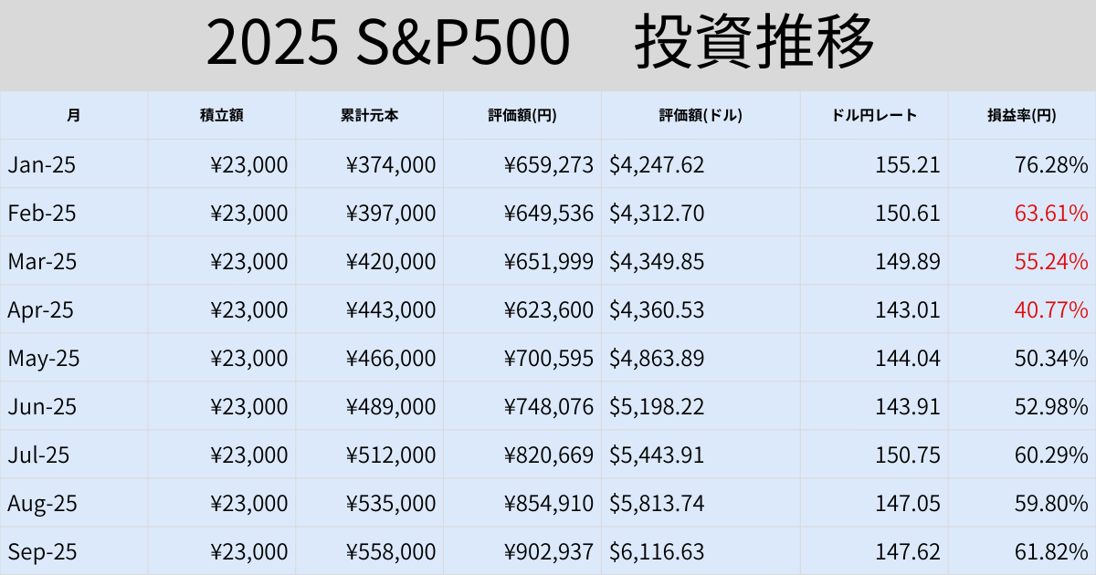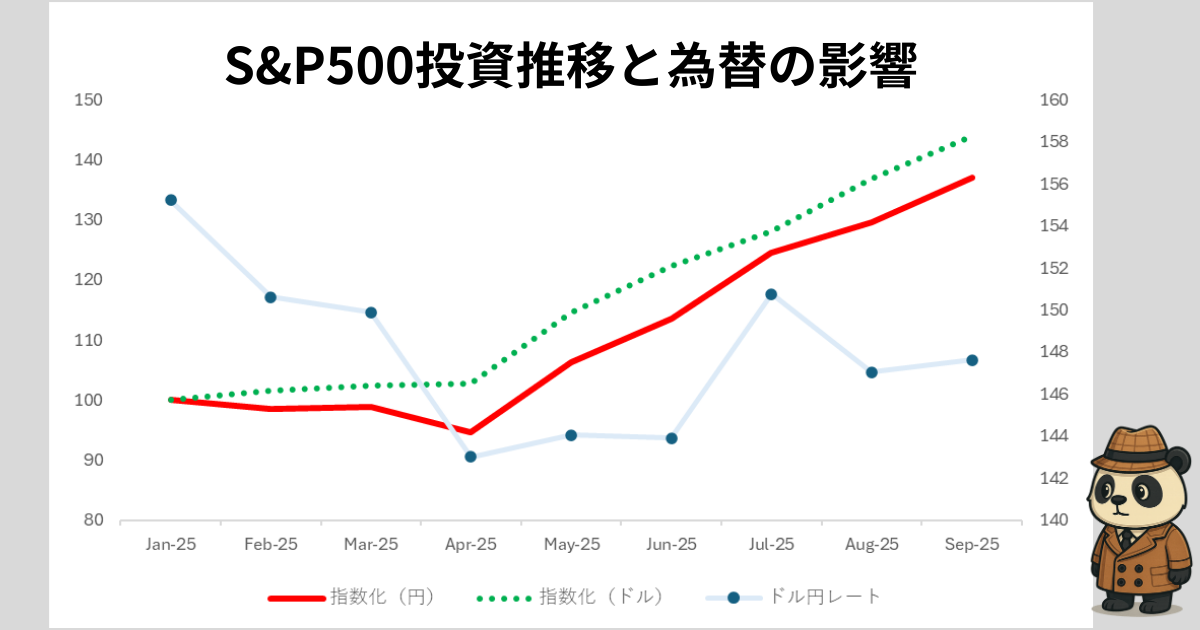 この記事では、2025年1月〜9月の投資推移を振り返りつつ、円建てとドル建てのS&P500の違い、そして為替リスクをどのように解釈するかについて整理します。