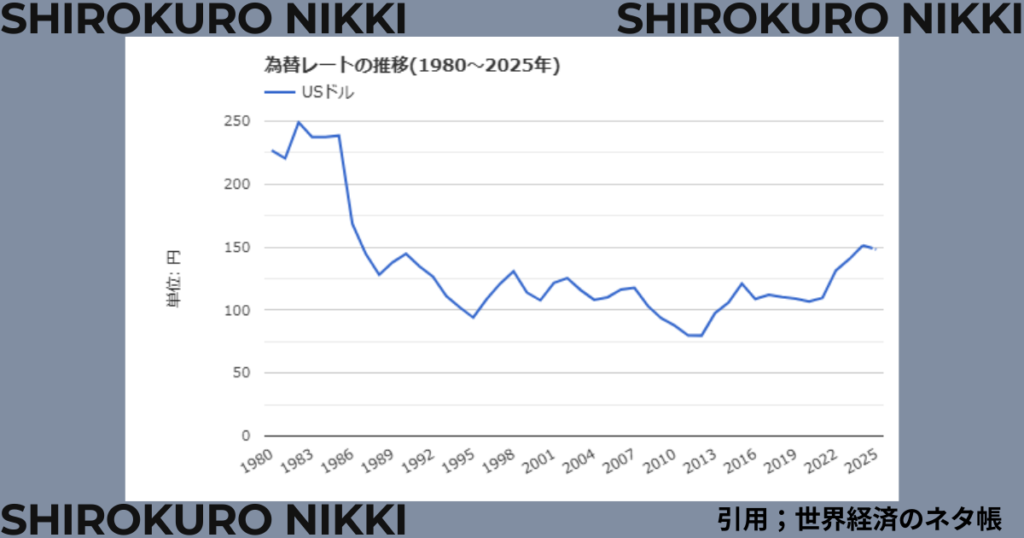 - しかし2022〜2025年の円安局面でその差は急速に解消し、50年スパンで見ると円建てもドル建てもほぼ同じ成長率に収束しています。