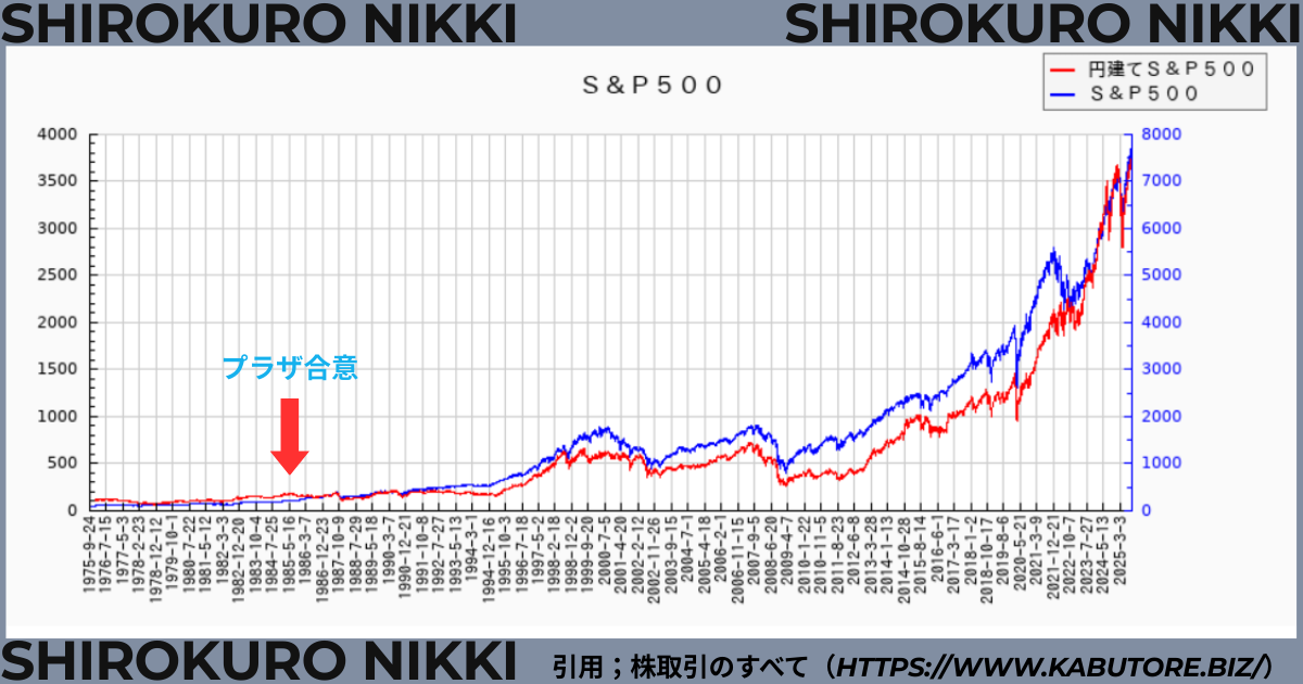 - 1985年のプラザ合意以降、日本は長期的な円高局面を経験し、円建てS&P500は長らくドル建てより劣後しました。