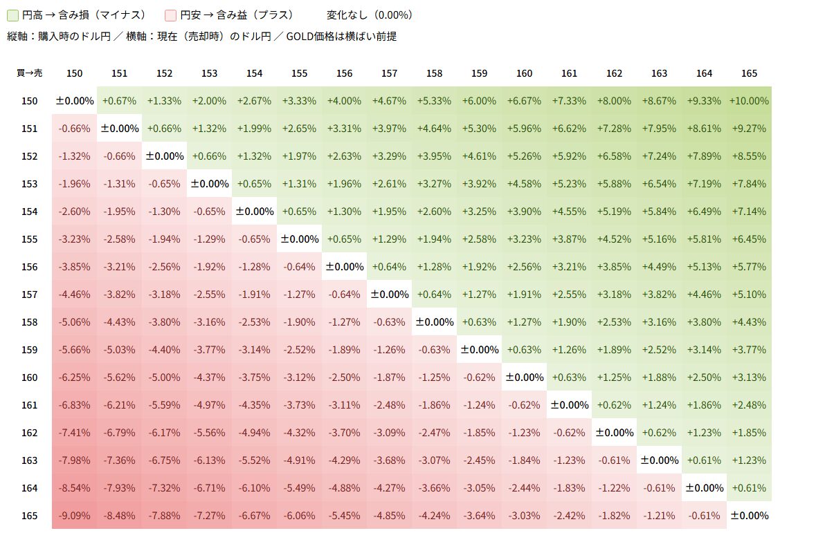 縦軸が「購入時のドル円」、横軸が「売却時のドル円」となっており、為替の変化だけで損益がどの程度動くのかを直感的に理解できます。